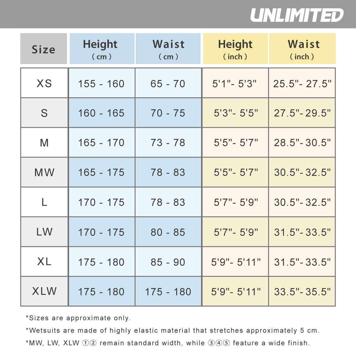 | XLW | 175-180 | 5'9" - 5'11" | 85-90 | 33.5" - 35.5" |